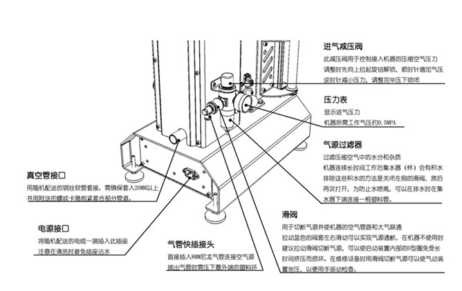 减压器上部旋钮可调节进气压力,进气压力决定整个机器气路系统的基本压力,一般出厂设置的气压适合用户大部分情况使用,因此无需频繁调整进气压力。过滤器在经过一段时间使用后,在杯体里会积存一些从气源过滤的水和杂质,排除这些水的方法是拉动进气滑阀先关闭气源,然后再打开,水会从杯体下方的排水阀排出。